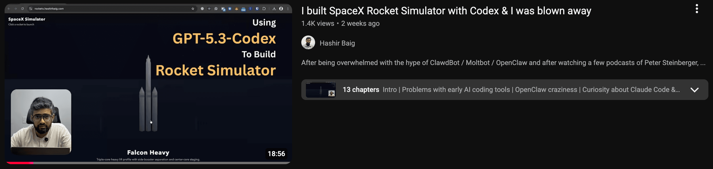 Over one weekend, I experimented with Codex by building a SpaceX Rocket Simulator, just to see how far the tooling could go when building something real from scratch. The result honestly blew my mind — not just because the simulator worked, but because of how effectively the model navigated the entire process: researching physics behaviors, structuring the application, and iterating through improvements.
